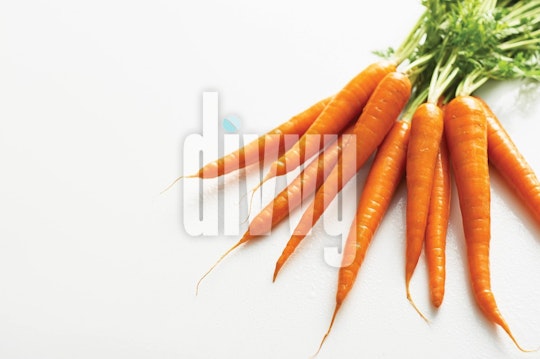 A bunch of freshly rinsed carrots with with green tops are gathered on a white surface.