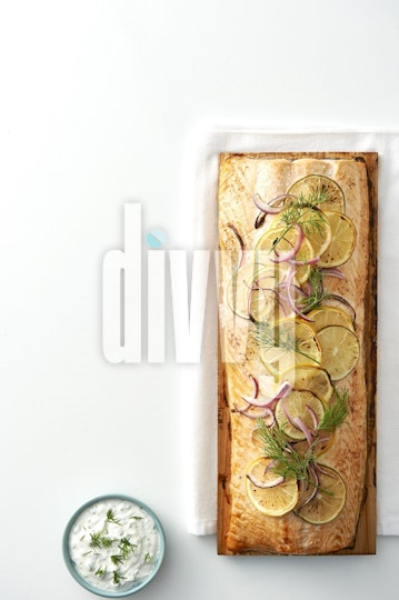 Cedar-Planked Salmon with Cucumber-Dill Sauce5 credits