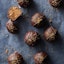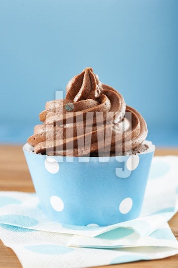 A chocolate cupcake with chocolate frosting is decorated with a blue wrapper.