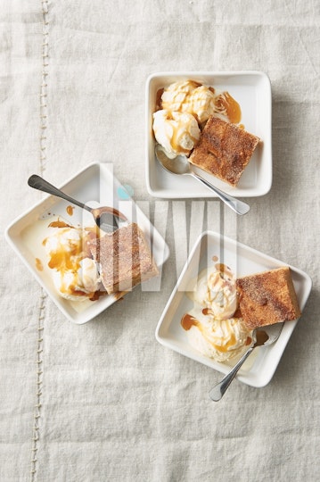 Three snickerdoodle cookie bars are served with scoops of ice cream drizzled with caramel sauce.