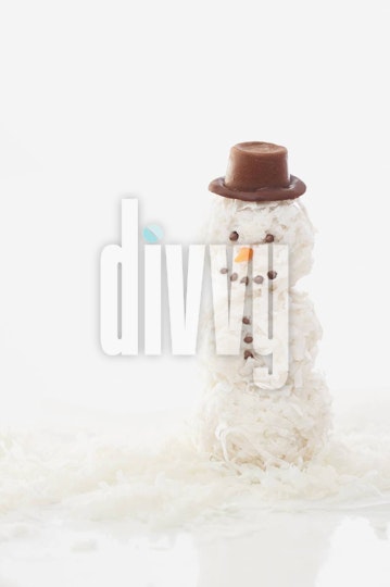 A snowman is made from cookie balls covered with coconut flakes and decorated with chocolate for the hat, buttons and eyes and candy for the nose and sits on a surface covered with coconut flakes.