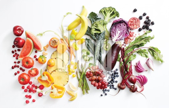 An assortment of colorful fruits and vegetables are arranged into a rainbow gradient on a white surface.