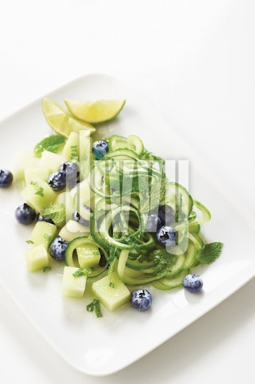 A spiralized cucumber salad mixed with honeydew melon, blueberries and fresh mint is served on a plate with two lime wedges.