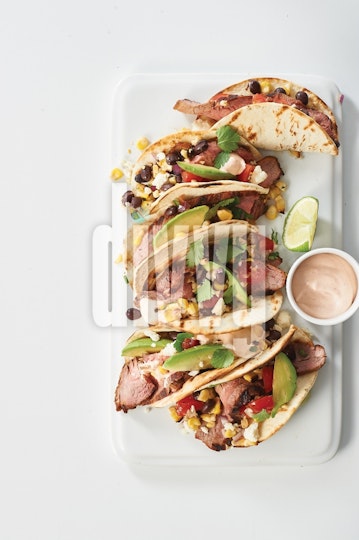 Flank steak taquitos are served on a serving tray with a ramekin of crema caliente sauce and squeezed lime on the side.