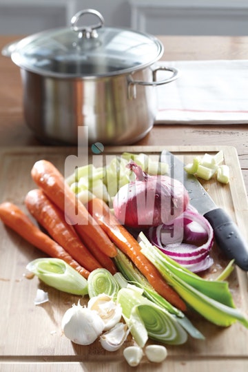 Fresh Vegetables on a Cutting Board with a Stainless Steel Pot