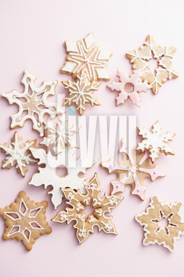 Decorated snowflake-shaped sugar cookies are piled on a pink surface.