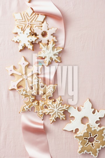 Snowflake shaped sugar cookies with pink and white frosting are piled on a pink tablecloth with a pink ribbon.