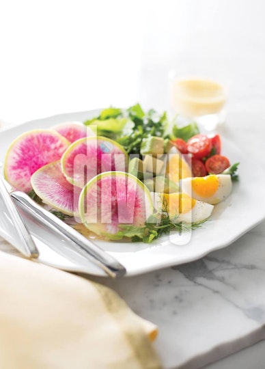 A salad made of spring greens, grape tomatoes, avocado, sliced watermelon radishes and hard-boiled eggs is served with a vinaigrette.