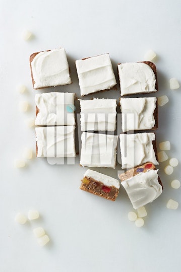 Gingerbread spice bars filled with colorful gum drops and slathered with creamy vanilla icing are cut into squares on a white surface.