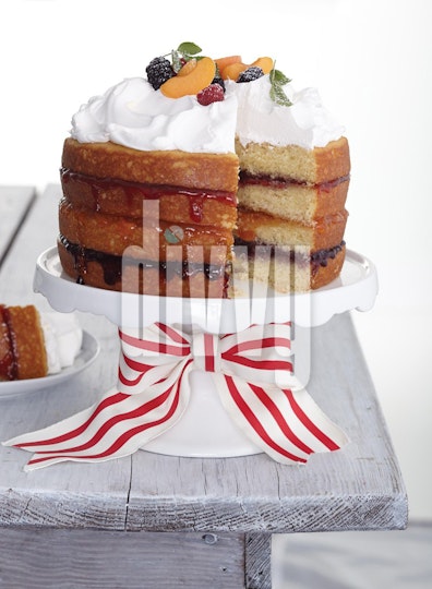 Jelly filling oozes from the layers of a naked almond cake topped with whipped cream and fruit and dusted with powdered sugar.