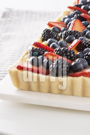 A fresh fruit tart filled with lemon curd is topped with whole blackberries and blueberries and sliced strawberries and served on a plate on a gray and white striped napkin.