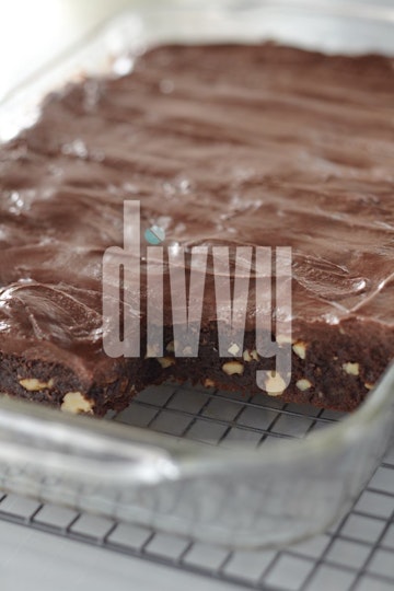A pan of classic frosted fudge brownies studded with walnuts cools on a wire rack.