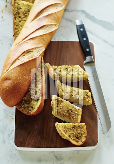 A knife rests in the process of cutting fresh garlic bread into slices.