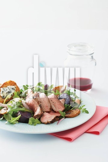 A white plate filled with arugula, beets, peaches and slices of steak sits on top of pink napkin next to jar with raspberry vinaigrette on a white surface.