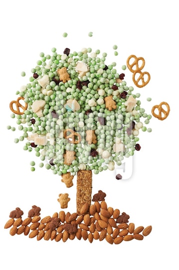 A snack mix consisting of freeze-dried peas, dried cranberries, crunchy granola and seed bars, teddy bear-shaped cookies, cinnamon apple slices, pretzels, graham bunnies, almonds and white baking chips are arranged into a tree and ground shape.