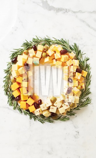 An assortment of cheese cubes, olives and fresh rosemary sprigs are arranged into a shape of a wreath on a marble background.