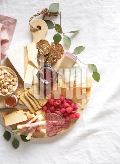 A charcuterie spread with salami, prosciutto, breads, crackers, cheeses, nuts and fruit is served decorated with eucalyptus branches on a white linen tablecloth.