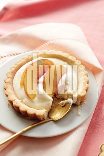 A spoon digs into slices of ripe nectarine nestled into a tart filled with a mascarpone lemon mixture.
