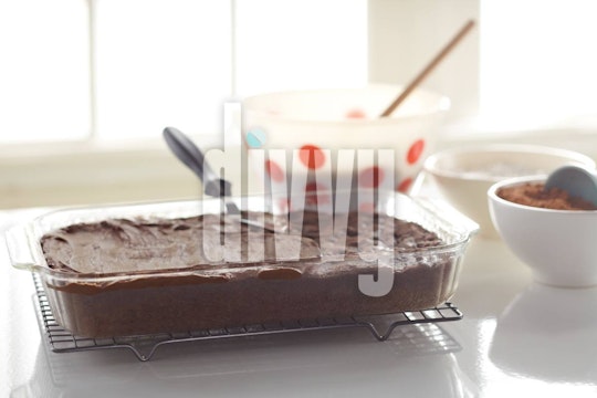 A glass pan of brownies on a wire rack is being topped with chocolate frosting, with a bowl of the frosting in the background.