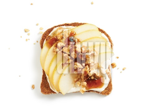 A toasted sprouted whole grain bread slice is spread with light cream cheese and topped with pear slices, chopped toasted walnuts and drizzled with maple syrup.