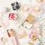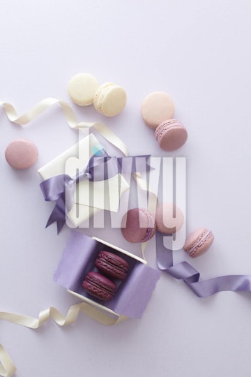 Purple and white macaroons surround a couple of gift boxes and curls of ribbon on a purple background.