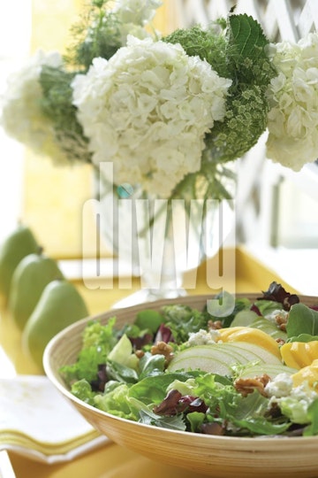 A spring green salad is topped with pear slices, mango slices, walnuts and gorgonzola and served next to a centerpiece arrangement of white hydrangeas and a line of green pears.