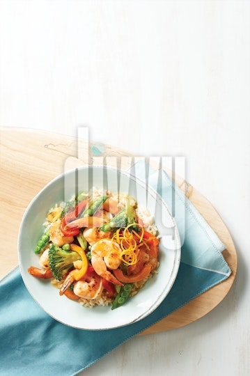 A bowl of ginger-shrimp stir-fry loaded with veggies and garnished with curls of orange zest is served on a wood cutting board.