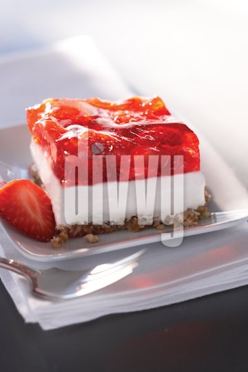 A slice of strawberry-pretzel salad with layers of pretzel crust, cream cheese filling and strawberry gelatin is served on a white plate with a fresh strawberry garnish.