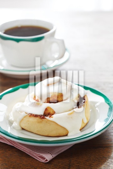 White frosting drips from the edges of a cinnamon roll served on a green and white plate with a mug of coffee in the background.