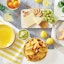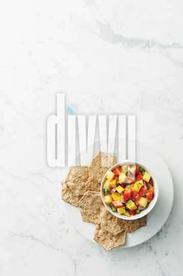 A bowl of tropical fruit salsa with mango, pineapple, strawberries, chopped onion and chile pepper is served on a plate with crackers.