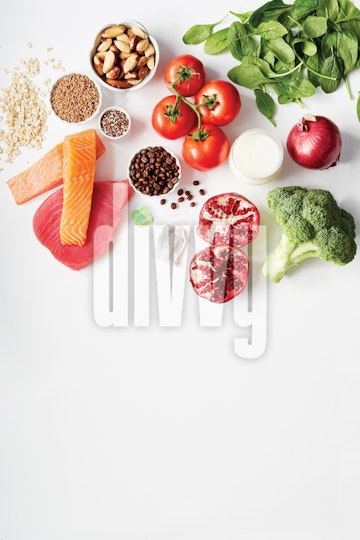 Healthy vegetables, fruit, grains, seafood and other foods are gathered on a white surface.