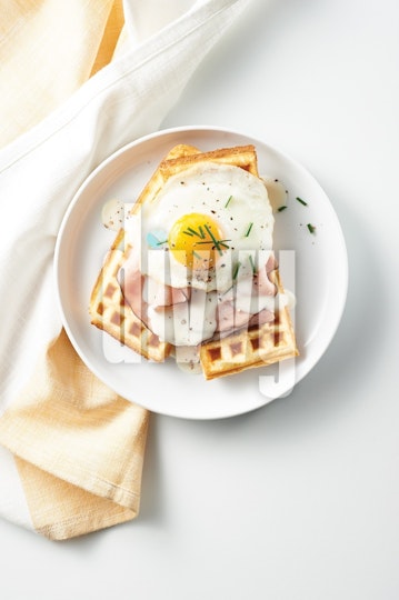 A twist on the traditional croque monsieur, this waffle madame is made with a waffle topped with Black Forest ham slices, bechamel sauce, a fried over-easy egg and garnished with cracked black pepper and chopped chives.