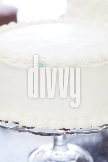 A smoothly-frosted cake is decorated with swirls and served on a glass cake stand.