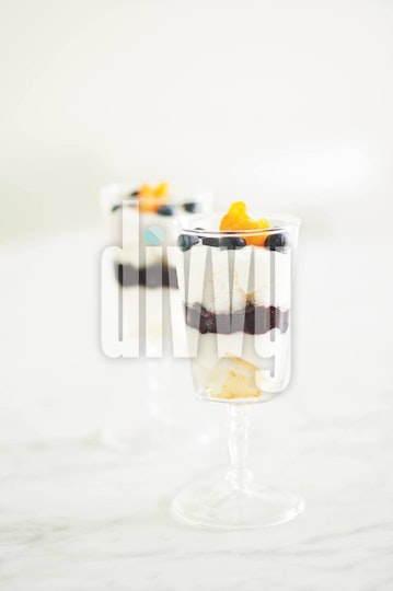 Trifles made with angel food cake cubes, blueberry jam, sweet yogurt and fresh blueberries and orange slices are served in modern glass goblets.